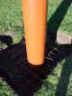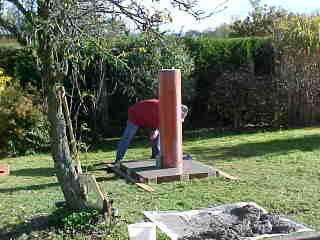 Ein Betonmischwagen brachte mir dann 1,5 Kubikmeter Beton den ich jeweils zuerst in einen Schubkarren einlaufen lies und dann abwechseln von allen Seiten in das Loch füllte. Die Kunststoffsäule sollte während des Befüllens schon mal grob nach der Wasserwaage ausgerichtet werden, sie lässt aber nachdem das Loch ganz mit Beton befüllt ist noch nachjustieren. Danach füllte ich mit einer Schaufel die Säule mit Beton auf. Ich habe also Säule und Klotz in einem Stück betoniert, es gab da überhaupt keine Probleme das der Beton in der Säule nach unten abgesackt wäre. Wichtig ist nur, das der Beton in der Säule mit einem Stück Holz oder so während des Einfüllens immer wieder mal nachgestampft wird.